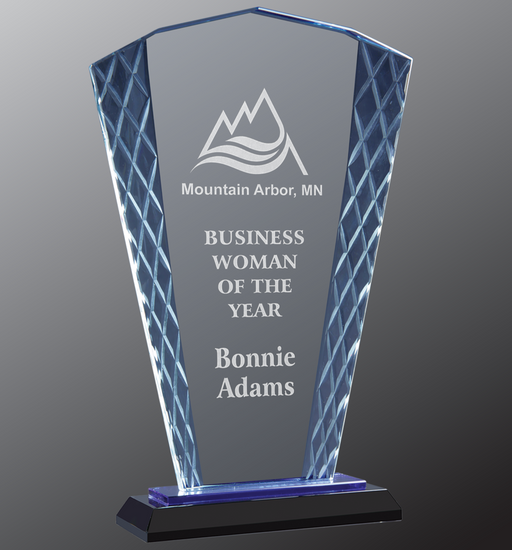 Glass award with blue and black silk screened back. Black screened base with felt bottom. 2 Sizes. Upright is 3/16” thick, base is ¼” thick glass...