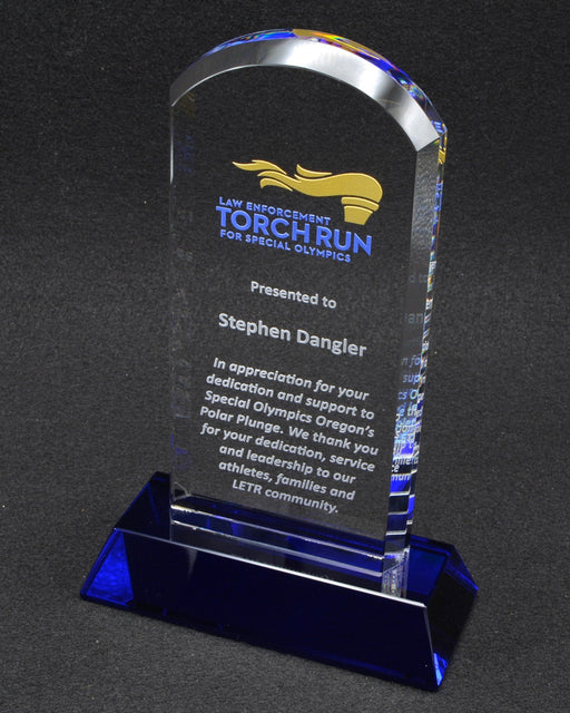 Crystal Arch Award with Blue Base. 9.8"H X 6"W with 0.8" Thick glass above base. Lined presentation box included. Deep Etch Sand Engraving IS INCL...