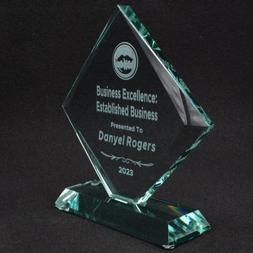 Clipped Jade Glass Diamond Award on a base. (2 Sizes). No presentation box. Deep Etch Sand Engraving IS INCLUDED in the price. Please email us yo...