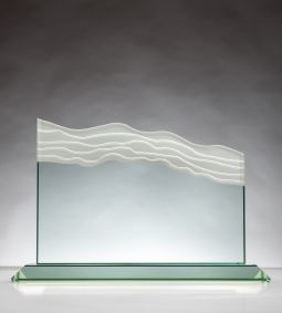Rapids Waterfall Glass Award. 10"w x 7"h x 1/2" with Base (Clear or Jade). No presentation box. Deep Etch Sand Engraving or Digital Color Print I...