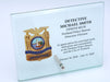 Police Glass Plaque with Badge. Full color printed for amazing color. Horizontal Self-Standing with pin back and beveled edges.