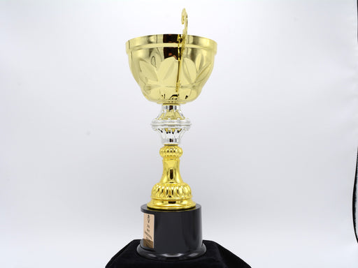 Gold with Silver Inlay Metal Trophy Cup. Includes Engraving plate on base. Metal cup, plastic stem, plastic weighted base. Engraving IS INCLUDED...
